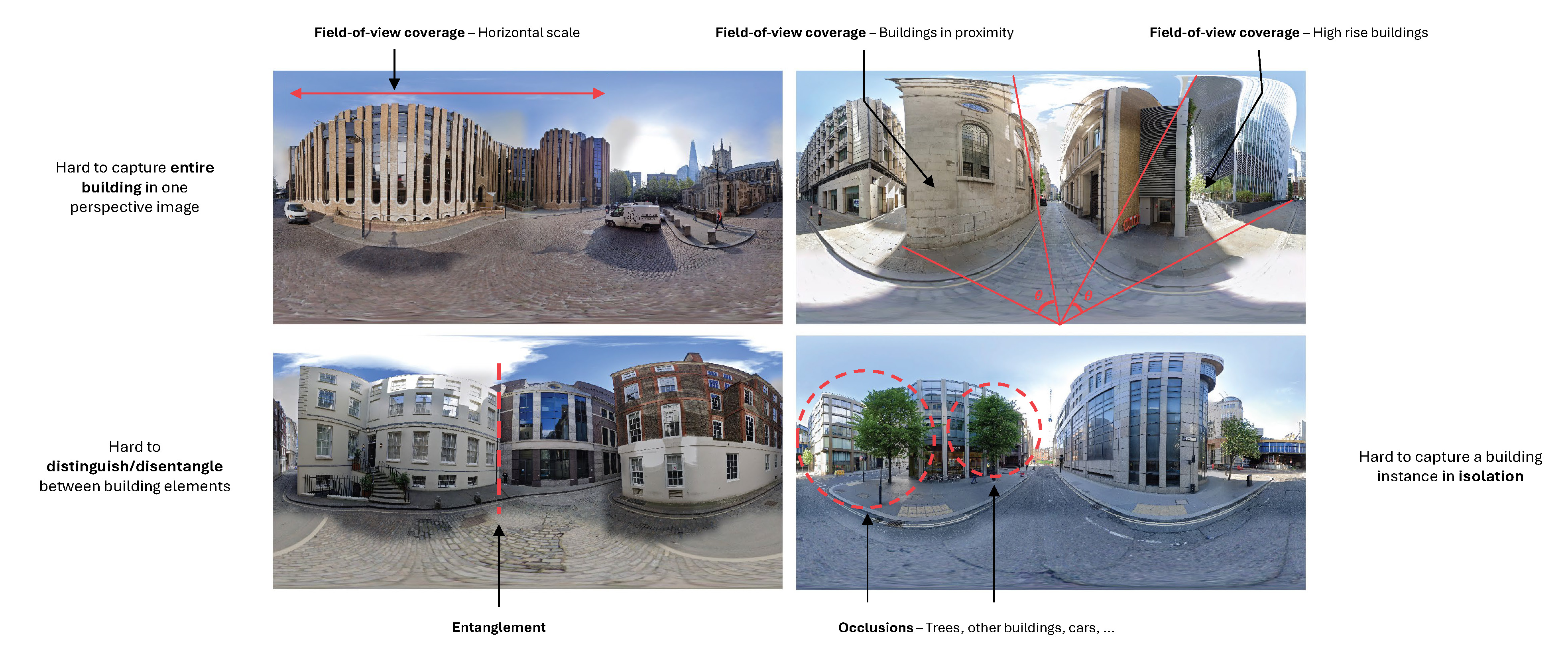 of field-of-view coverage, occlusions and entanglement in street-view imagery. This is explored