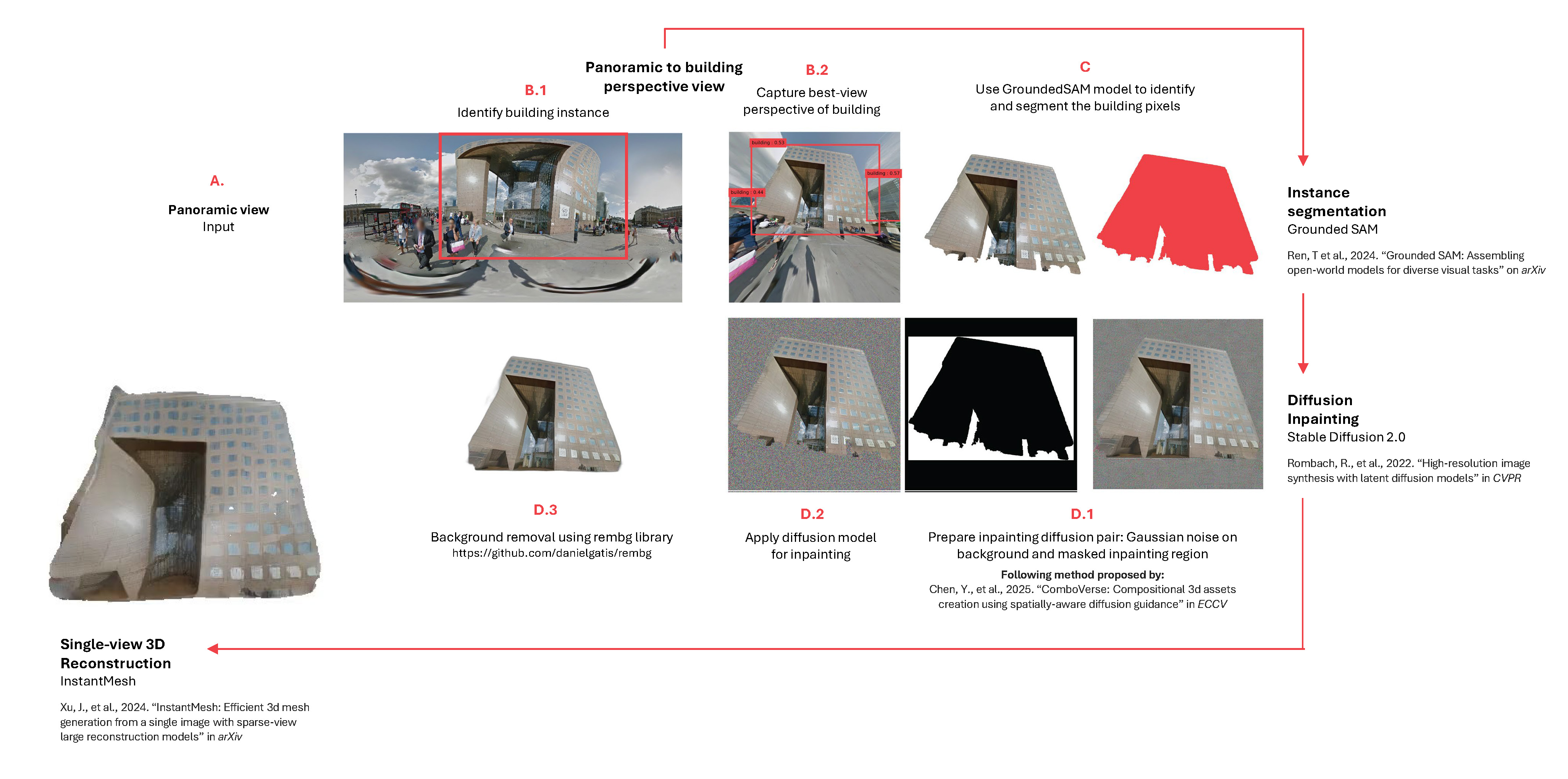 for building reconstruction from street-view imagery. It addresses the unique challenges